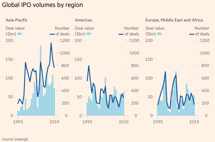 IPO listings were disappointing in Europe, Middle East, Africa. The 179 IPOs marked a 40% fall from the 2018 levels and a lowest of 7 years. The Brexit uncertainty heavily affecting the listing in UK and elsewhere in Europe. London Stock Exchange showed a 62 percent drop in listings.